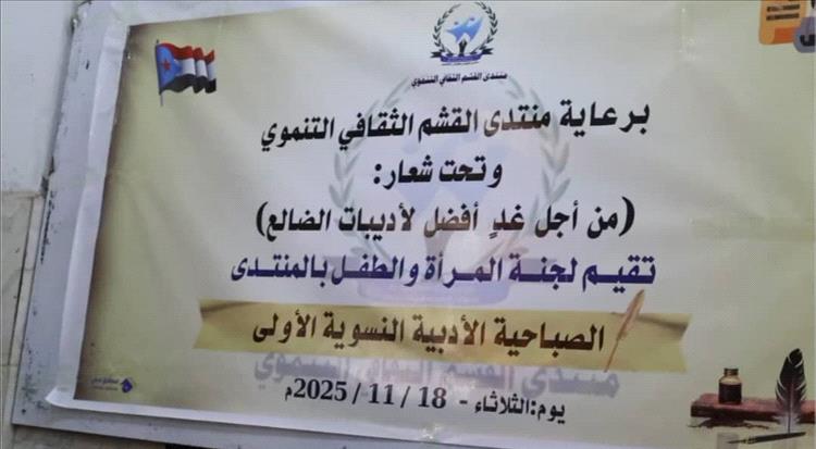تحت شعار (من أجل غدٍ أفضل لأديبات الضالع) وتزامناً مع إحتفالات شعبنا بذكرى الإستقلال الثلاثون من نوفمبر الخالدة أقامت لجنة المرأة والطفل بمنتدى القشم الثقافي التنموي صباح اليوم الثلاثاء ١٨-١١-٢٠٢٥ الصباحية الأدبية النسوية الأولى والتي إستضافتها جامعة خليج عدن الدولية بمدينة الضالع"