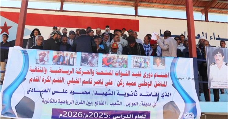 بحضور مستشار الرئيس عيدروس الزًبيدي وراعي الثقافة والتنمية الشيخ محسن ناصر القشم وبرعاية ثانوية الشهيد محمود العبادي أختتمت صباح اليوم الأحد ٢٣-١١-٢٠٢٥ بملعب شهداء مدينة العوابل مديرية الشعيب بالضالع منافسات دوري فقيد القوات المسلحة والحركة الرياضية والثقافية المناضل الوطني الجسور العميد ركن / علي ناصر قاسم الخيلي (القشم) لكرة القدم والذي إقامته ثانوية الشهيد محمود العبادي بين الفرق الرياضية لطلاب الثانوية العامة والذي أستمر عشرون يوماً.