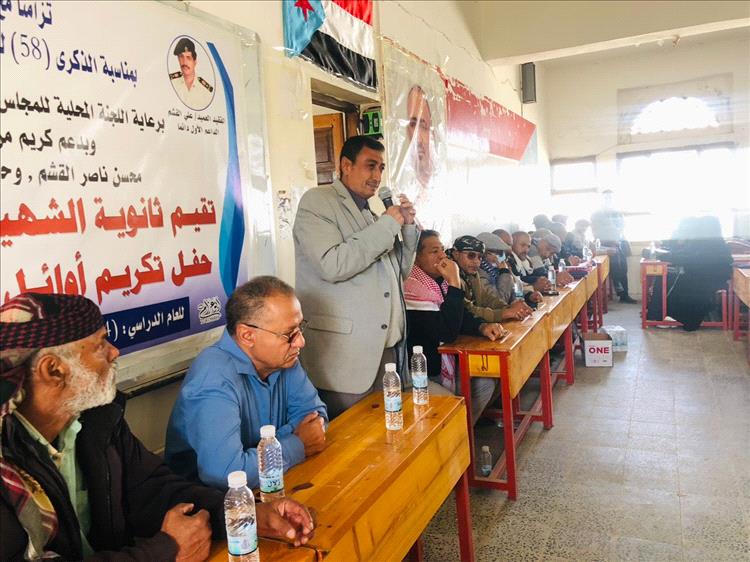 بدوره فقد أثنى رجل الخير والعطاء الشيخ محسن ناصر القشم أبو مطهر على جهود إدارة الثانوية والمعلمين، وأعرب عن سعادته بالحضور في أقدم ثانوية بالمديرية،وأكد أن التكريم حافز مهم للطلبة" كما أشار أبو مطهر إلى ضرورة إلتزام الطلاب بالدوام المدرسي وعدم مغادرة الصفوف قبل الوقت المحدد.