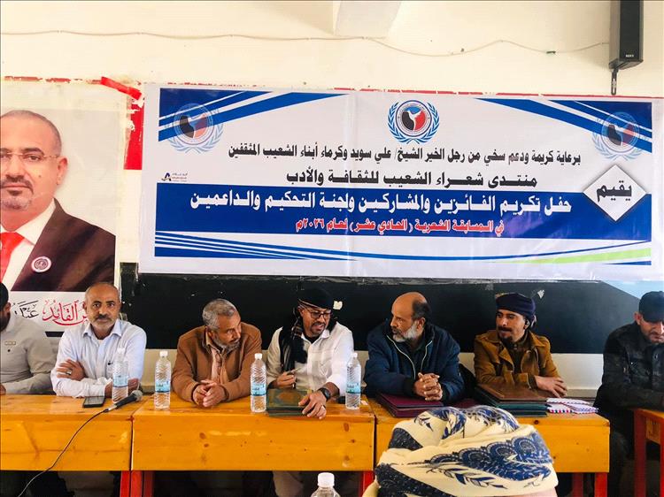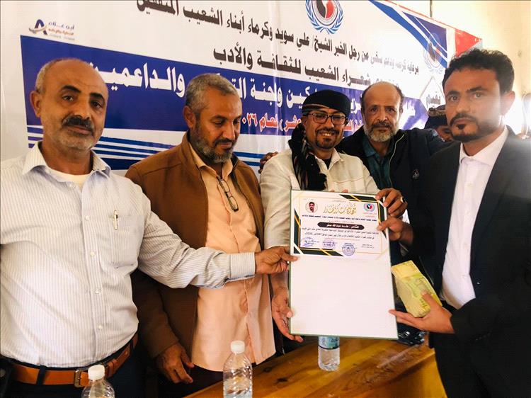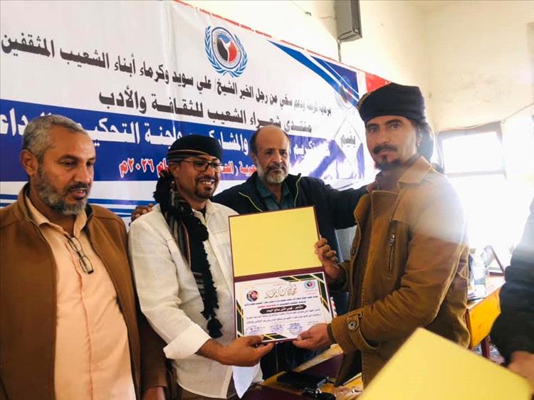 برعاية كريمة وبدعم سخي من رجل الخير الشيخ علي سويد وأبناء الشعيب المثقفين أقيم صباح الخميس الماضي حفل تكريم لمنتدى شعراء الشعيب محافظة الضالع بنسخته 11 للعام 2026 وذلك بحضور قيادة السلطة المحلية والمجلس الإنتقالي وأعضاء من الهيئة الإدارية لمنتدى القشم الثقافي التنموي ورئيس إتحاد الأدباء وكتاب الجنوب بالضالع وشعراء وأدباء ومشائخ وأعيان وشخصيات اجتماعية من مختلف مديرية الشعيب.