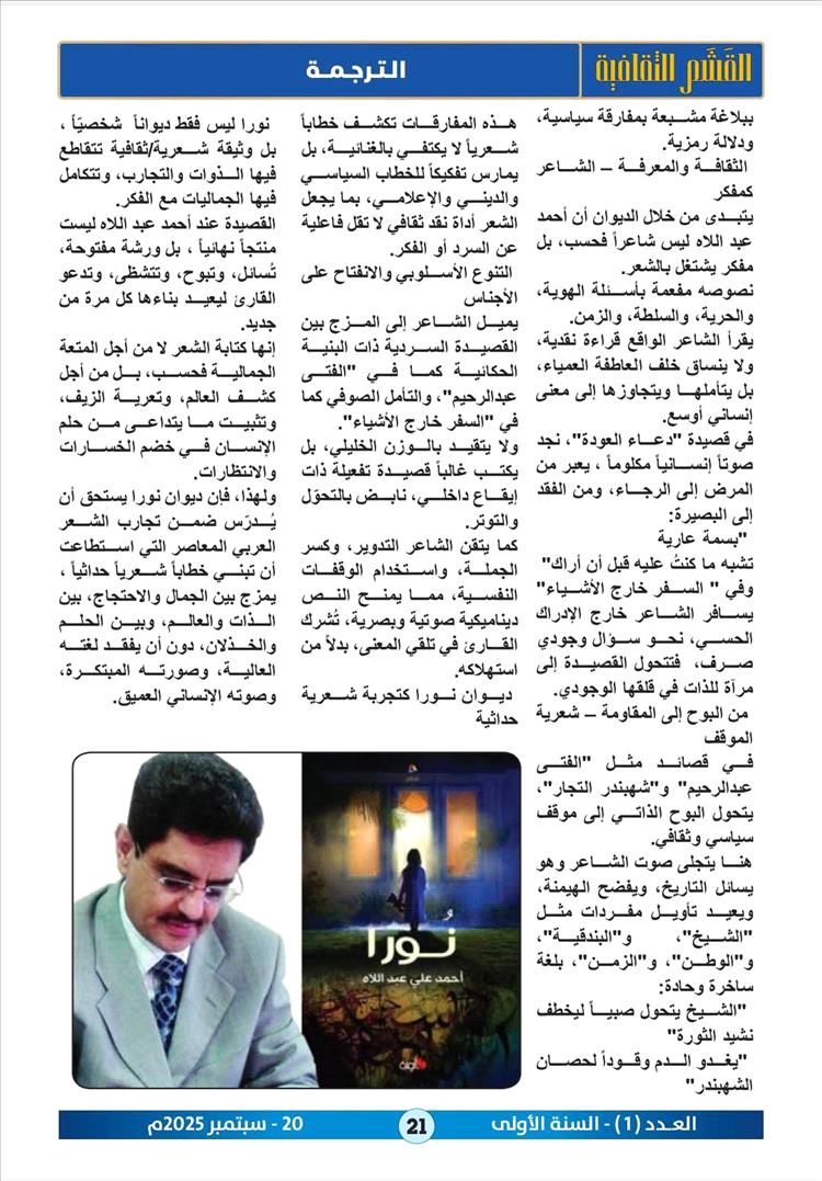 ملفات ثقافية متنوعة تطرق أبواب: التراث، الترجمة، الفنون.